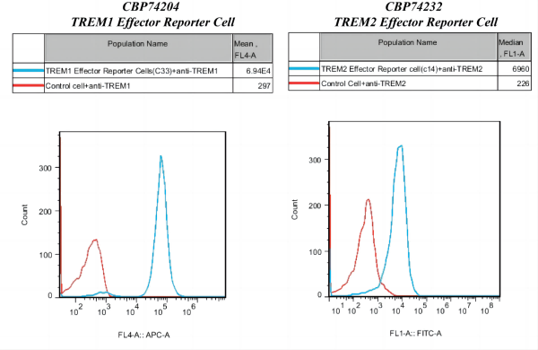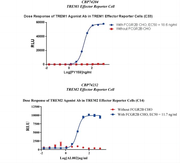 Figure 3. Response of agonist Ab in TREM1 Effector Reporter Cell or TREM2 Effector Reporter Cell.