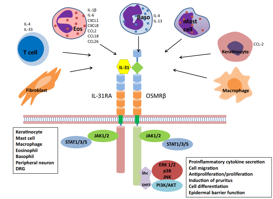 IL-31(白細(xì)胞介素31)于2004年被Dillon等人發(fā)現(xiàn),是一種四螺旋束細(xì)胞因子,有2個(gè)長螺旋和2個(gè)短螺旋,屬于糖蛋白130 (gp130)/IL-6細(xì)胞因子家族。IL-31最初被證明是由激活的輔助T細(xì)胞產(chǎn)生的,尤其是Th2細(xì)胞、肥大細(xì)胞、巨噬細(xì)胞和樹突狀細(xì)胞,此外在嗜酸性粒細(xì)胞、嗜堿性細(xì)胞等中也有IL-31的表達(dá)。IL-31與瘙癢感覺神經(jīng)纖維表面IL-31RA亞基結(jié)合,激活OSMR亞基發(fā)生異構(gòu),主要通過磷脂酰肌醇30-激酶/蛋白激酶(PI3K/AKT)通路、Janus激酶/信號轉(zhuǎn)換器和轉(zhuǎn)錄激活因子(JAK/STAT)通路及絲裂原激活的蛋白激酶(Ras/Raf/MAPK)通路。IL-31信號通路的下游轉(zhuǎn)錄因子的激活會(huì)參與不同的基因表達(dá),比如炎癥、遷移、分化、(抗)增殖、細(xì)胞存活和屏障功能等。