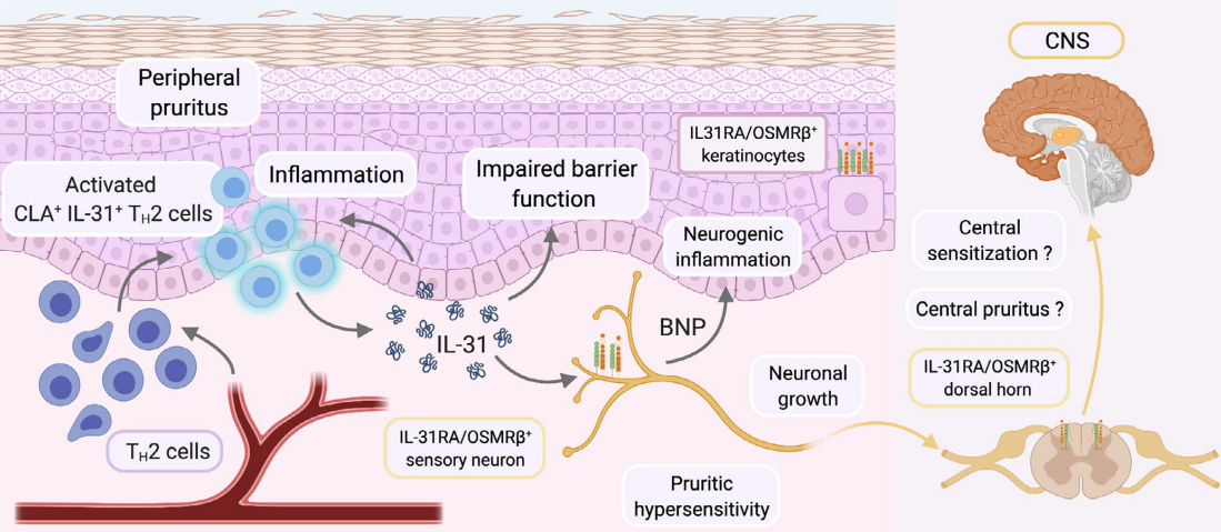 CLA T2細(xì)胞是特應(yīng)性皮炎(AD)患者循環(huán)中豐富的過敏原反應(yīng)性T細(xì)胞,通過CCL17和CCL22信號被募集到AD感染的皮膚。在皮膚中,CLA T2細(xì)胞分泌IL-31,進(jìn)而激活表達(dá)IL31RA/ OSMR β-的皮膚感覺神經(jīng)、天然免疫細(xì)胞(包括DC)、單核細(xì)胞和嗜酸性粒細(xì)胞以及角質(zhì)形成細(xì)胞。在AD皮膚中,角質(zhì)形成細(xì)胞顯示IL31RA/OSMRβ表達(dá)水平升高,導(dǎo)致對IL-31的接受性增強(qiáng)。皮膚IL-31信號通過IL-31介導(dǎo)的終分化基因(如聚絲蛋白和脂質(zhì)包膜減少)的抑制,導(dǎo)致外周瘙癢、(神經(jīng))炎癥和屏障功能受損?;罨慕琴|(zhì)形成細(xì)胞分泌各種化學(xué)引誘劑,觸發(fā)表達(dá)IL -31的CLA Tu2細(xì)胞額外募集到炎癥部位,形成皮膚炎癥和瘙癢的反饋循環(huán)。人和犬的感覺神經(jīng)元表達(dá)IL31RA/ OSMRβ主要在TRPV1共表達(dá)的神經(jīng)元中。IL-31與IL31RA/ OSMR β結(jié)合后,通過下游信號通路上調(diào)瞬時(shí)受體電位香草酸受體1(tansient receptor potential vanilloid,TRPV1)及瞬時(shí)受體電位受體A1(TRPA1)表達(dá),增強(qiáng)神經(jīng)元興奮性,促進(jìn)晚期及慢性瘙癢形成。