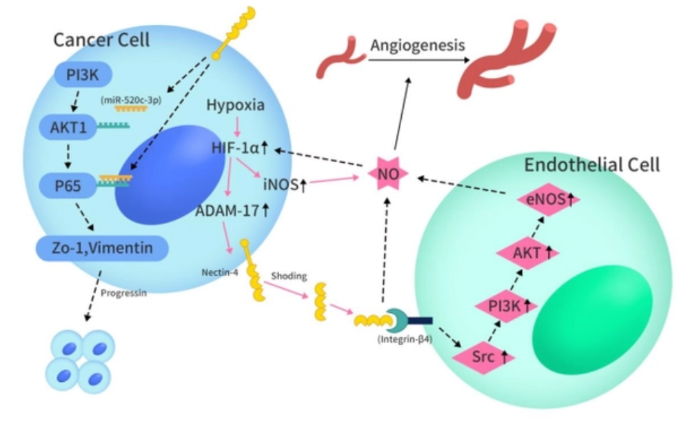 Nectin-4在正常的胚胎和胎兒組織中含量很高,但成年人的正常組織中通常表達(dá)較低,且在各種癌細(xì)胞上表達(dá)較高,比如宮頸癌、尿路上皮癌、乳腺癌、肺癌、胃癌、頭頸癌、胰腺癌等,主要通過(guò)激活PI3K/Akt途徑促進(jìn)腫瘤細(xì)胞增殖、分化、遷移、侵襲等。